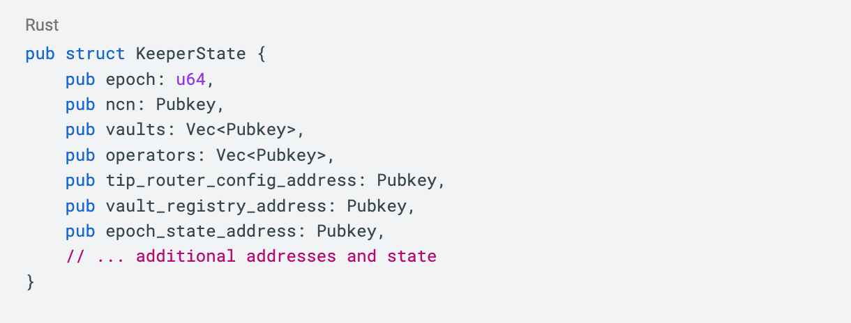 Using TipRouter as an example, the keeper maintains all essential addresses and state information, as shown below. This is core functionality to keep track of the voting process and stake delegations until quorum (>66%) is reached.
