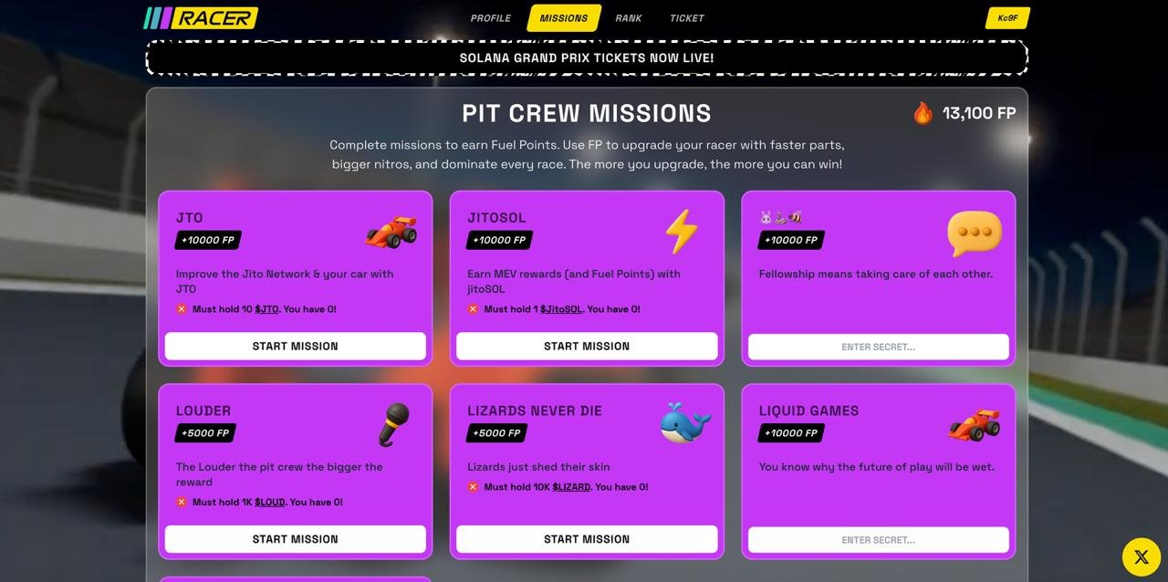 On November 5th, the Racer dot fun team announced a campaign for JTO and JitoSOL holders providing 10k Fuel points on the platform as well as individual missions.