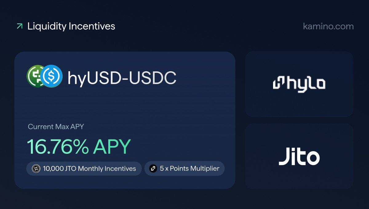 On November 5th, 2025 new incentives were announced for the hyUSD-USDC and hyUSD-JitoSOL on Kamino. All hyUSD-JitoSOL LP depositors are eligible to earn a share of 5k JTO incentives per month.