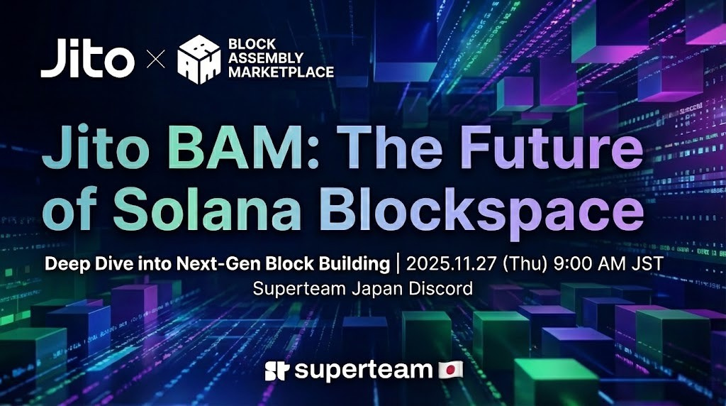On November 26th, Superteam Japan hosted a deep-dive study session into BAM block-building with the community. Featuring guest speaker Alejandro, BD at Jito Labs, and Atsushie, JET Asia Community Lead.