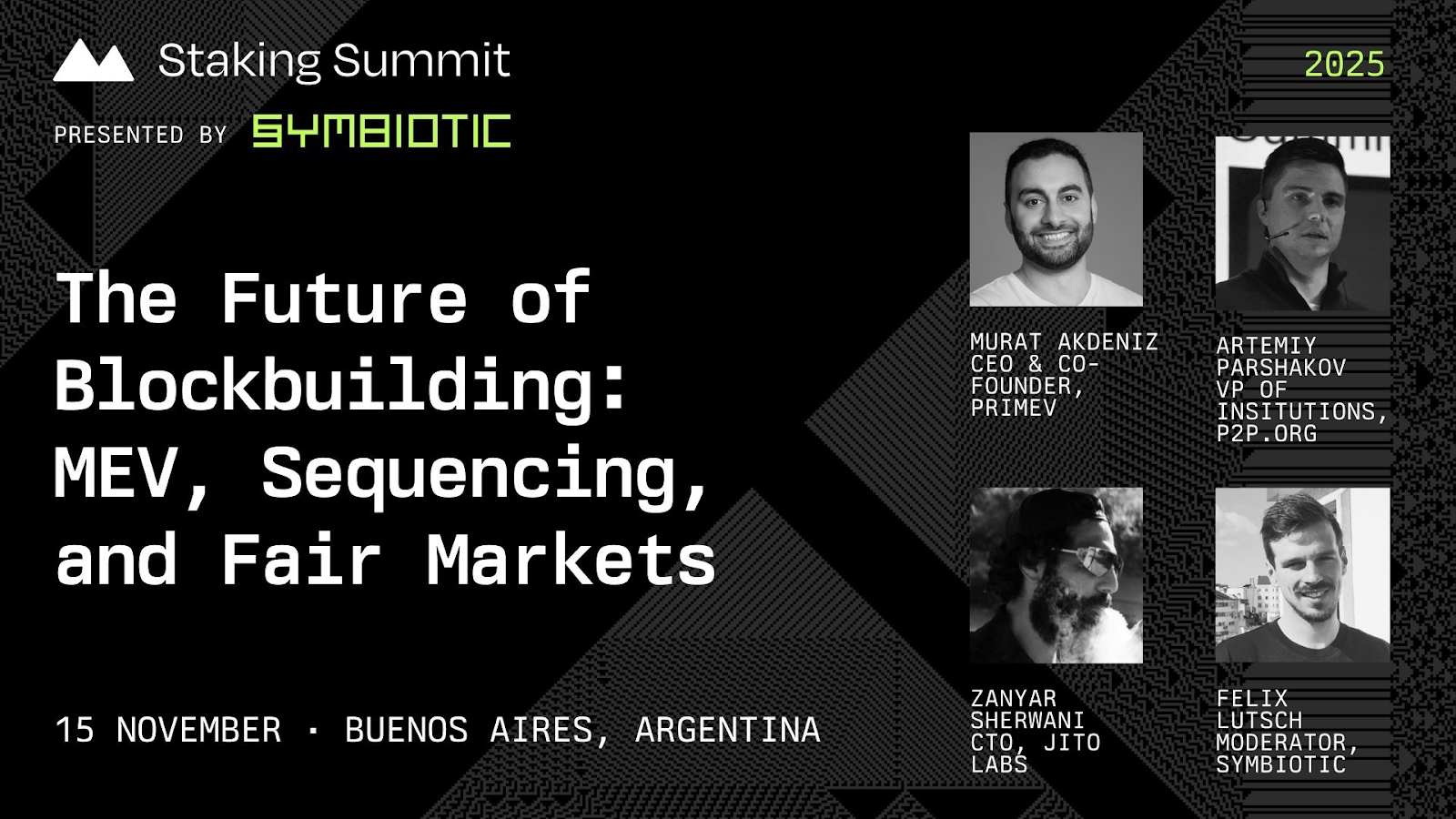 On November 15th, Jito Labs CTO and co-founder @segfaultdoctor appeared on a Staking Summit panel in Buenos Aires titled "The Future of Blockbuilding: MEV, Sequencing, and Fair Markets" hosted by Symbiotic.