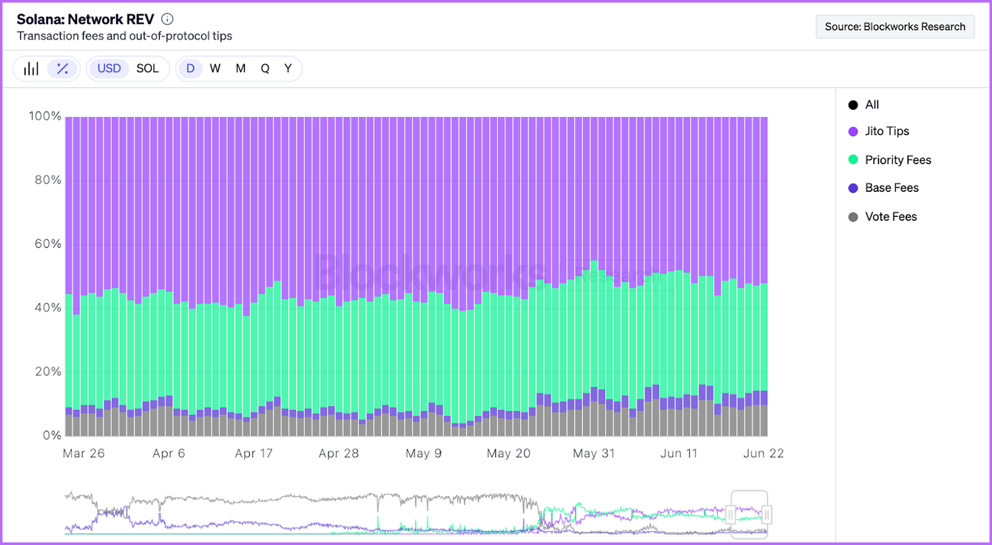 Priority fees make up roughly 35-40% of Solana’s REV; however, since SIMD-0096 passed, validators capture 100% of priority fees, and stakers do not realize any of this revenue stream. While there are efforts to create an in-protocol mechanism to share these fees with stakers (via SIMD-123), the timing of the implementation is unclear. In the meantime, non-standardized methods are cumbersome and not widely adopted, and they introduce fragmentation.